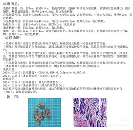 What we see with our naked eyes: A section of intestinal tube at the stoma was 4cm long and 0.8cm in diameter, with a peeled surface, a small amount of skin attached around the stoma, and dark red mucosa everted; when the intestinal tube was opened, the mucosal folds were disordered, the wall thickness was 0.2cm-0.5cm, and the gray-red texture was slightly hard. There are two sections of blind-ended intestine, 1.2 cm and 1.5 cm long, 0.8 cm and 1.2 cm in diameter, with adhesion on the surface, one end is blind, the wall is 0.2 cm thick, and the texture is gray-red and soft. There are also two sections of intestinal tube, 0.5cm and 1.2cm long, 0.6cm and 1.0cm in diameter, 0.2cm thick, gray-red and soft. There is also a piece of intestinal wall tissue, 1.0cm×1.0cm in area, 0.2cm thick, gray-red and soft. A cord-like object, 5.5cm long, 0.5cm in diameter, gray-red and soft. There was one appendix, 4.0 cm long and 0.4 cm in diameter, with a smooth gray-red surface and no obvious pus or perforation. The appendix cavity contained a small amount of secretions, with a wall thickness of 0.1 cm and gray-red and soft texture. Pathological diagnosis: (Stomal intestinal tube) Focal necrosis and inflammation of the stoma mucosa, ganglion cells were found in the intestinal wall muscle and submucosal. (Appendix) The blood vessels in the appendix wall were dilated, congested and hemorrhagic. Ganglion cells were found in the intermuscular and submucosal layers. There was old hemorrhage in the serosa layer with giant cell reaction. (See also blind-end intestinal tube) Chronic inflammation of the mucosal layer, ganglion cells are found in the myenteric and submucosal regions, some smooth muscle degeneration and disordered arrangement, fibrous tissue hyperplasia of the serosa accompanied by chronic inflammation and calcification, giant cell reaction, smooth muscle hyperplasia of focal small blood vessel walls, thickening of the vessel walls, and stenosis of the lumen. (See also Intestinal Tube and Intestinal Wall) Ganglion cells were found in the intestinal wall muscle and submucosal layer, and giant cell reaction and punctate calcification were found in the focal serosa. The cord-like structures were sent for examination and showed old hemorrhage and calcification, granulation tissue, fibrous tissue proliferation and giant cell reaction. Immunohistochemistry: 2024-10314-2 (blind intestinal tube): CD31 (+), SMA (+), Calponin (+), ERG (+). 2024-10314-4 (cord-like tissue): SMA(+), ERG (+). Special staining: 2024-10314-2 (blind intestinal tube): elastic fiber staining (+). 2024-10314-4 (cord-like tissue): elastic fiber staining (+). Consider arterial dysplasia in combination with clinical findings. Please rule out arterial fiber muscle dysplasia (FMD) in combination with imaging and other examination results, and have regular follow-up examinations after treatment. Attached pictures: